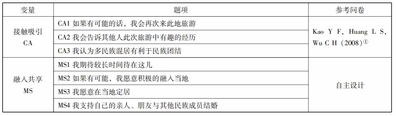 本研究用以方差为基础的结构方程模型(Variance-based SEM)进行分析,用其典型分析方法——偏最小二乘法(PLS—SEM)。研究先用SPSS软件进行描述性分析及探索性因子分析,而后用SmartPLS软件进行模型构建。相比于以协方差为基础的结构方程模型(Convarience—based SEM,CB—),PLS—SEM有更广泛的适用性,不强调数据或残差必须符合正态分布,可以更好的处理复杂的变量关系,更加适用于理论的验证、探索和发展,无需充分的理论基础。本研究主要是对旅游促进各民族“三交”的内在机理进行探索,由于相关的前期研究较少,面临着黑箱问题,没有经典有效的理论来解释或者描述其中的过程,因此本研究适宜用PLS—SEM进行分析。