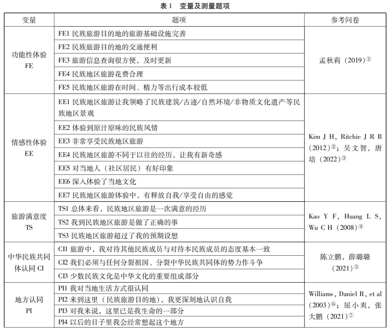 设计合适的问卷以便更好反映实际情况,对相关变量的测量主要借鉴已有问卷,并结合旅游促进各民族“三交”的实际情况做出适当的修改和调整。对问题的测量主要使用李克特7级量表,从1-7分别表示从“非常不认同”到“非常认同”的各层级(见表1)。