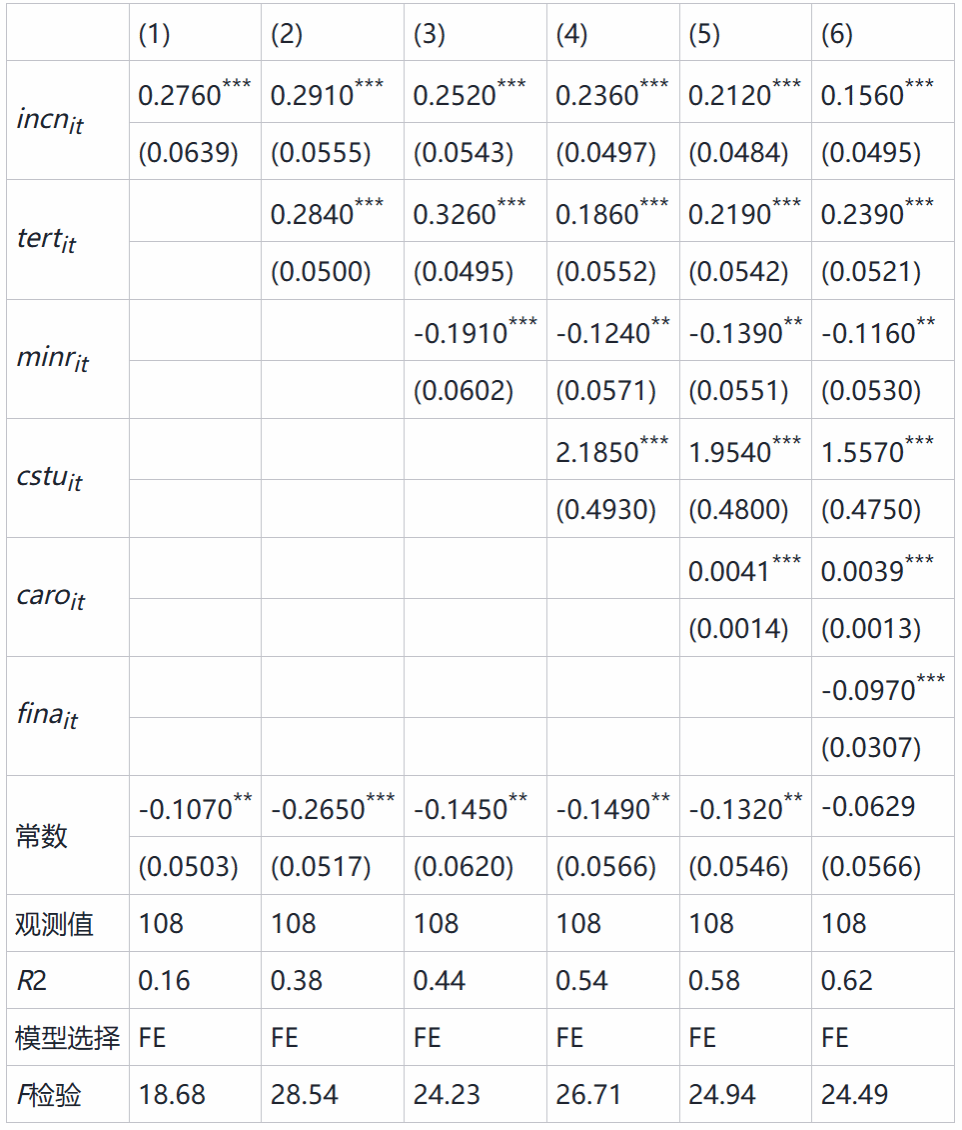 研究基于面板数据特征,在同一设定下分别估计了随机效应(RE)与固定效应(FE)模型,并结合Hausman检验对模型设定进行判别,结果见表3(为节省篇幅RE结果不再列示)。Hausman检验统计量显著,拒绝了随机效应模型的原假设,说明个体不可观测效应与解释变量之间存在相关性。在此情况下,固定效应模型能够有效控制区域间不随时间变化的异质性因素,更适合刻画普惠金融发展的影响机制。此外,固定效应模型的R2明显高于随机效应模型,进一步验证了固定效应模型在解释力上的优势。基于以上模型选择思路,表3报告了固定效应的逐步回归结果。总体上,模型拟合优度显著提升,变量的系数方向与显著性保持一致,在逐步回归的过程中,各因素对普惠金融的影响表现出良好的稳健性。