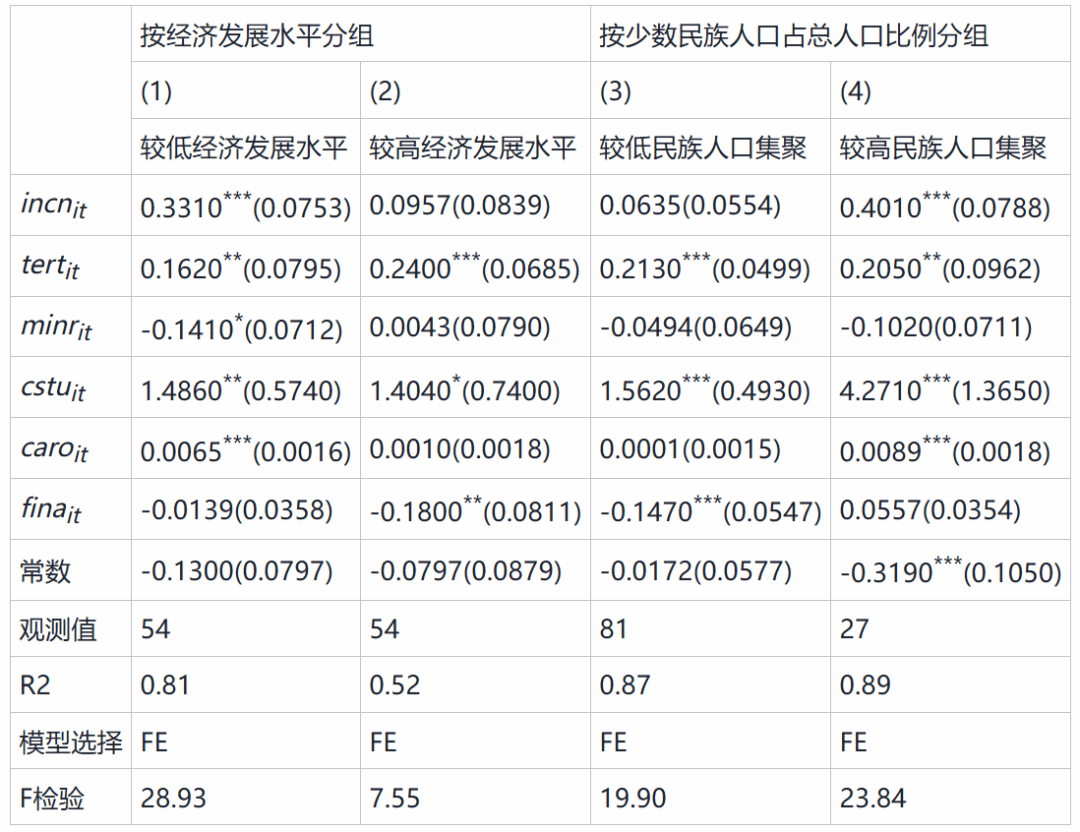 为进一步检验普惠金融影响因素在不同地区的影响程度差异,本文对样本从经济发展水平和民族人口集聚程度两个维度进行分组检验。