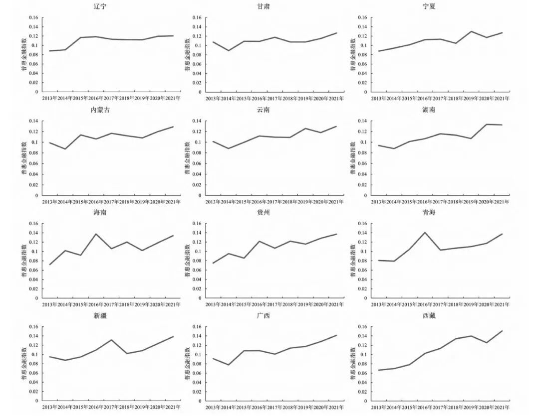 鉴于现有研究对民族地区尚未有统一的定义,本文参考曹妍雪和马蓝(2017)的做法,选取本地区少数民族人口比例大于全国少数民族比例的省级行政区作为民族地区。根据第七次全国人口普查数据,全国各少数民族人口占总人口的比重为8.89%。通过比对,有12个省级行政区少数民族人口所占比重大于全国平均水平。故本文将西藏、新疆、青海、广西、贵州、宁夏、云南、内蒙古、海南、辽宁、甘肃、湖南这12个省级行政区作为民族地区。在确定民族地区的基础上,进而利用2013-2021年上述省级行政区面板数据测度民族地区普惠金融发展水平。数据来自《中国统计年鉴》、各省级行政区统计年鉴、《中国金融年鉴》《中国民族统计年鉴》、Wind数据库等。