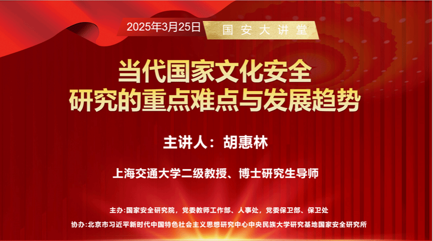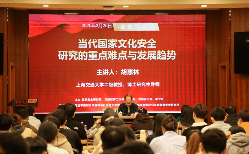 举办了2025年“国安大讲堂”第一讲。特邀上海交通大学二级教授、博士研究生导师胡惠林教授在海淀校区知行堂作题为“当代国家文化安全研究的重点难点与发展趋势”的专题讲座。