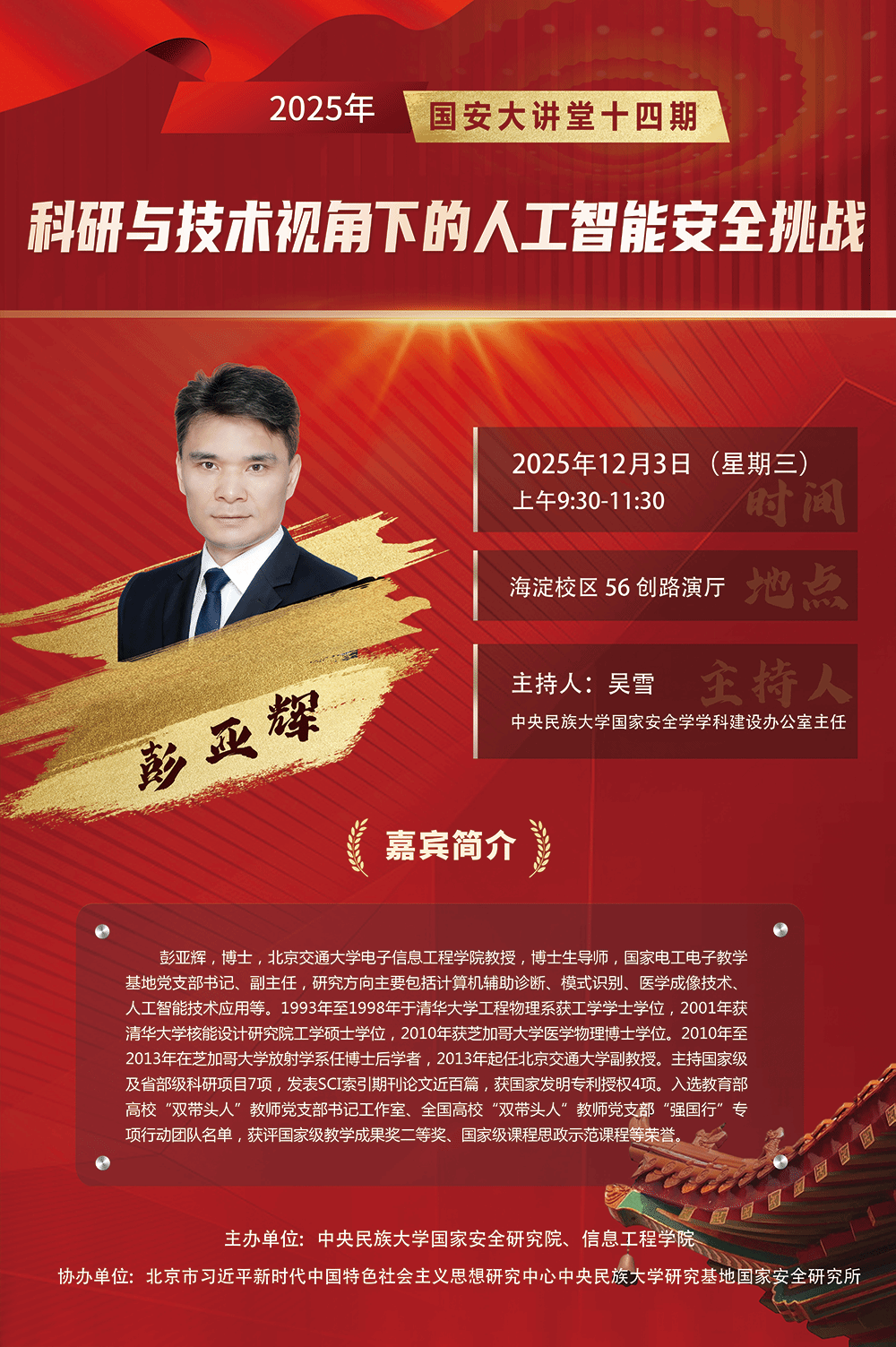 为国家安全与科技发展提供坚实支撑,构建兼具理论深度与实践效能的智能安全研究体系,熟女视频 将于2025年12月3日举办“国安大讲堂”第十四期,具体安排如下:
